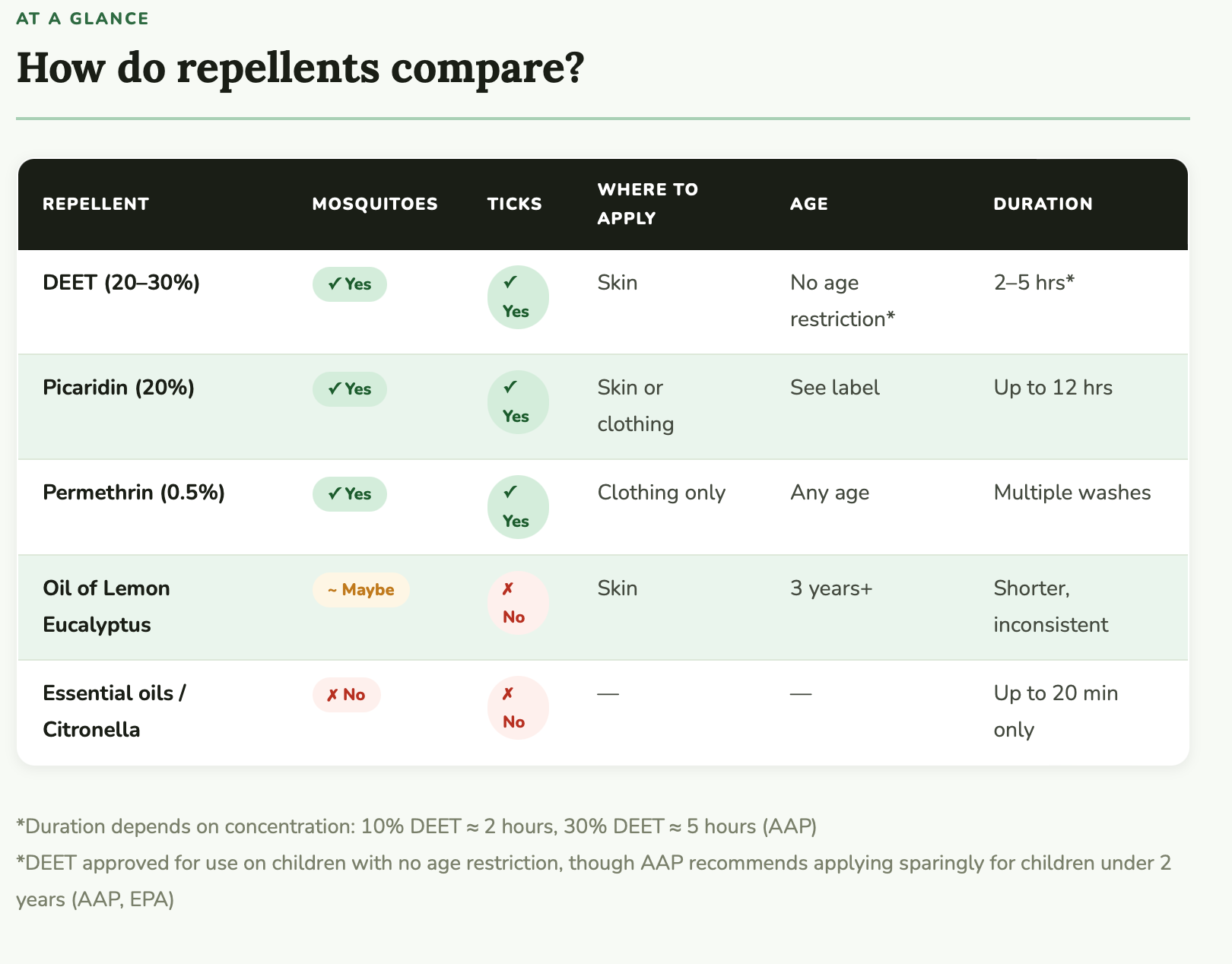 Choose EPA-registered DEET (10–30%) or Picaridin (20%) for skin — DEET approved for children with no age restriction, apply sparingly for children under 2 years (AAP, EPA)